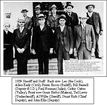 Patteson’s career was interrupted by the election of Andrew Wilke in 1939. Wilke’s staff consisted of ten deputies. Among these were future sheriff’s captain Bill Barnett, Bill’s future boss, Sheriff John Ellis, and matron Grace Bixby, grandmother of television star Bill Bixby. By this year the Sheriff’s Office had a radio and dispatcher.