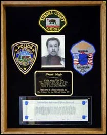 This memorial hangs in the Lompoc, California, Police Department where Frank had served as a Police Officer during the '70's. The inscription reads: